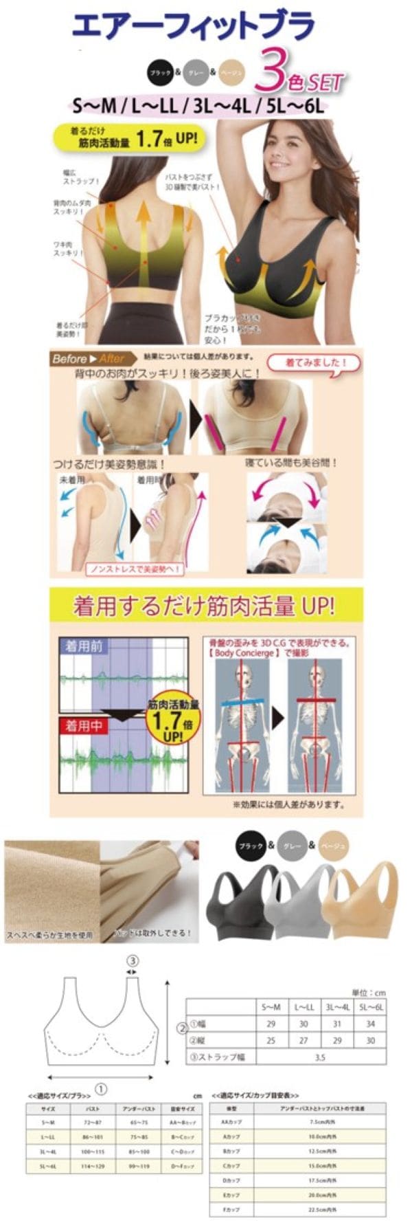 3色組【5L-6L/シンプルカラー(ブラック/グレー/ベージュ)】エアーフィットブラ | ノンワイヤー驚きの解放感!「楽キレイ」にバストメイク&美姿勢ブラ!