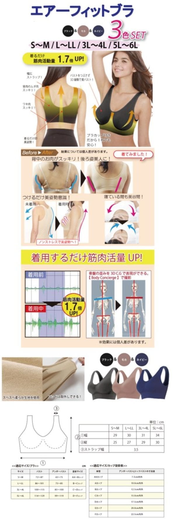 3色組【3L-4L/クラシックカラー(ブラック/モカ/ネイビー)】エアーフィットブラ | ノンワイヤー驚きの解放感!「楽キレイ」にバストメイク&美姿勢ブラ!