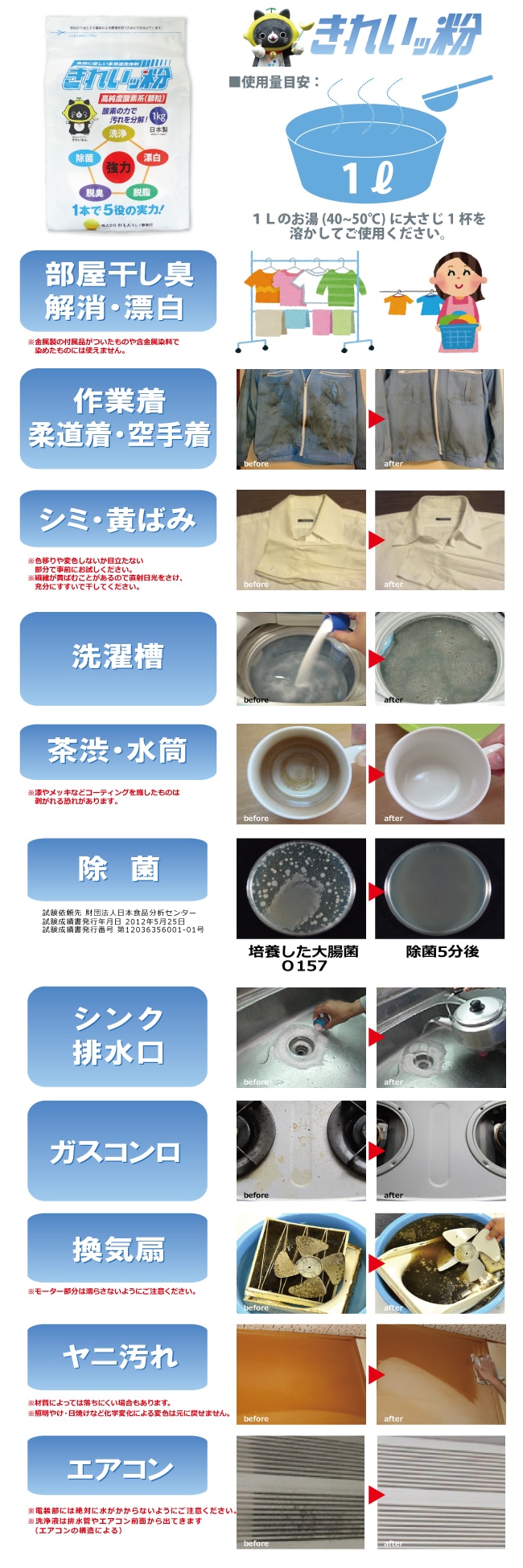 [2袋セット] 自然に優しい多用途洗浄剤「きれいッ粉(1kg)」※日本製 | 酸素の力で汚れを分解!1袋で5役(洗浄・除菌・脱臭・脱脂・漂白)のスゴ腕!