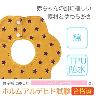 可愛い花形のスタイうれしいお得な5枚セット。形状がまるいのでどの角度でもよだれをキャッチしてくれるので安心。素材は 綿、TPU防水で柔らかく、優しくて安心です。ドリンクをこぼしても安心、防水シートを挟んでいるので安心ですね。可愛い花びらよだれかけが、より一層あなたのベビーをかわいくする商品です。