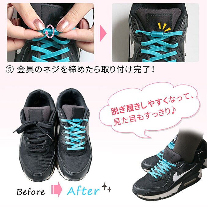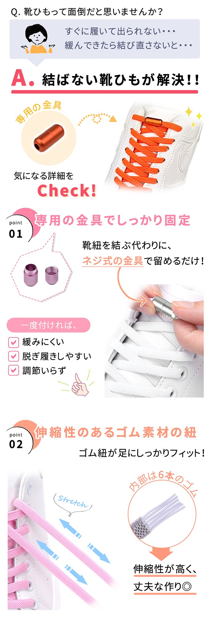 ・伸縮するゴム素材なので足にしっかりフィット!結ばず解けないのでそのまま脱ぎ履きできます。