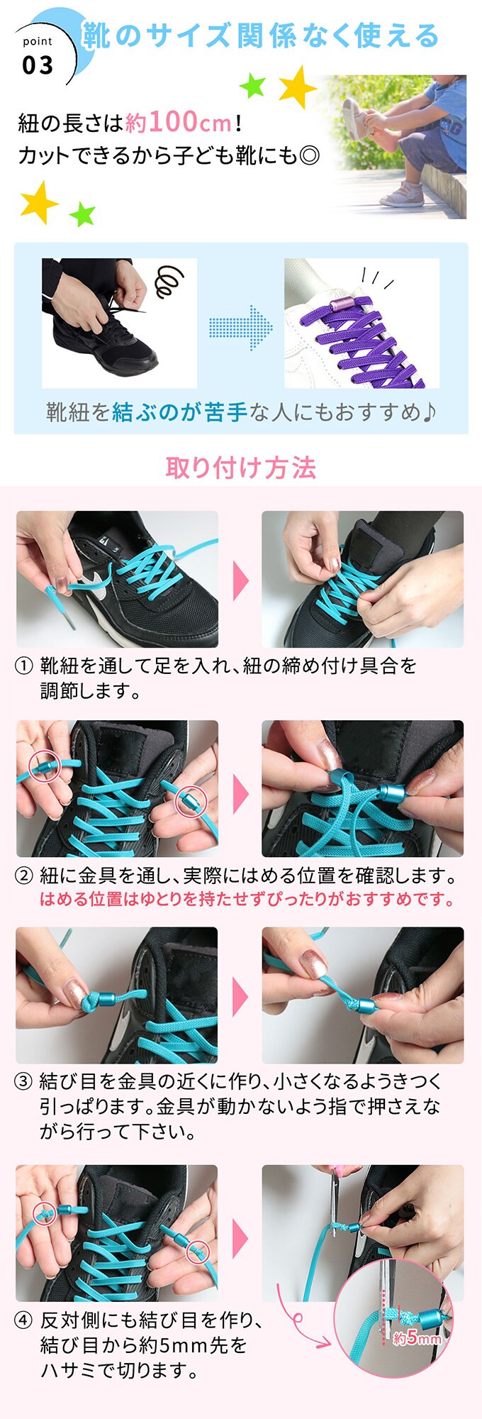 ・ひもの長さは約100cm!カットできるからお子様の靴にも使えます。