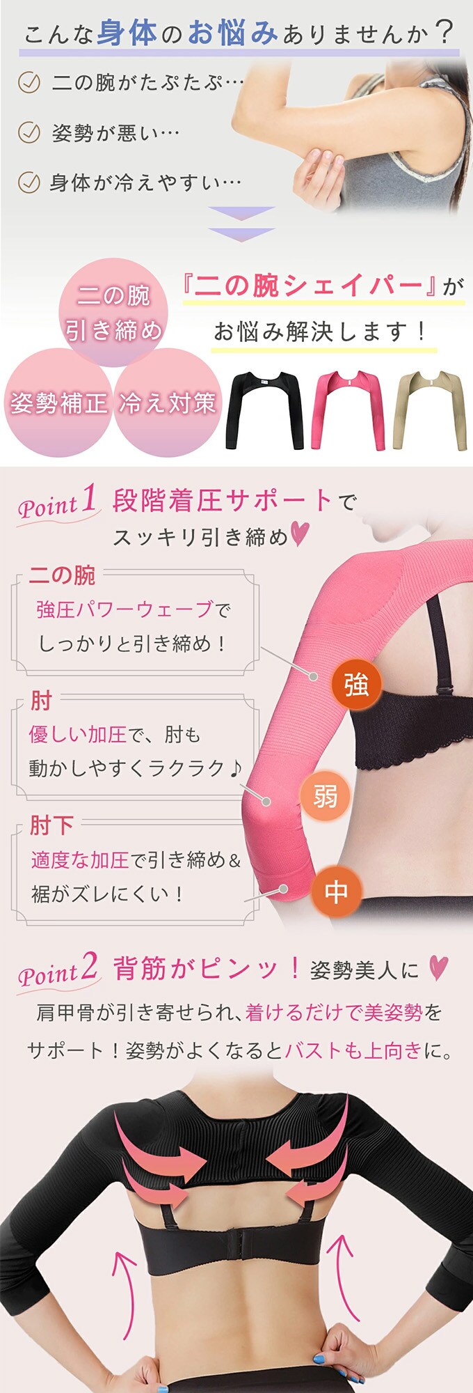 二の腕(強)・肘(弱)・肘下(中)の段階着圧サポートで