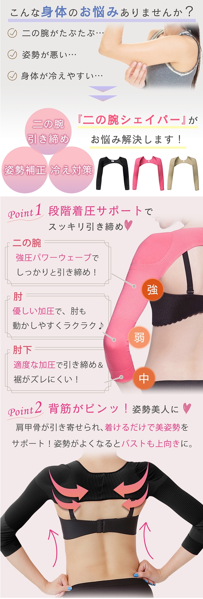二の腕(強)・肘(弱)・肘下(中)の段階着圧サポートで