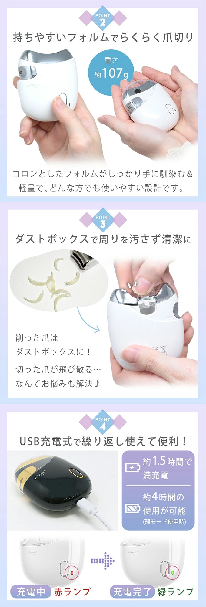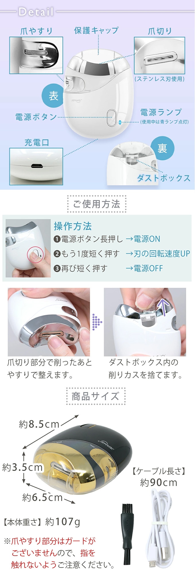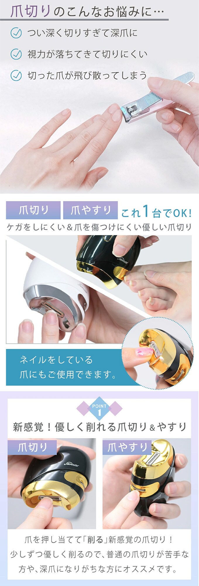 少しずつ優しく削るので、普通の爪切りが苦手な方や深爪になりがちな方におすすめです。