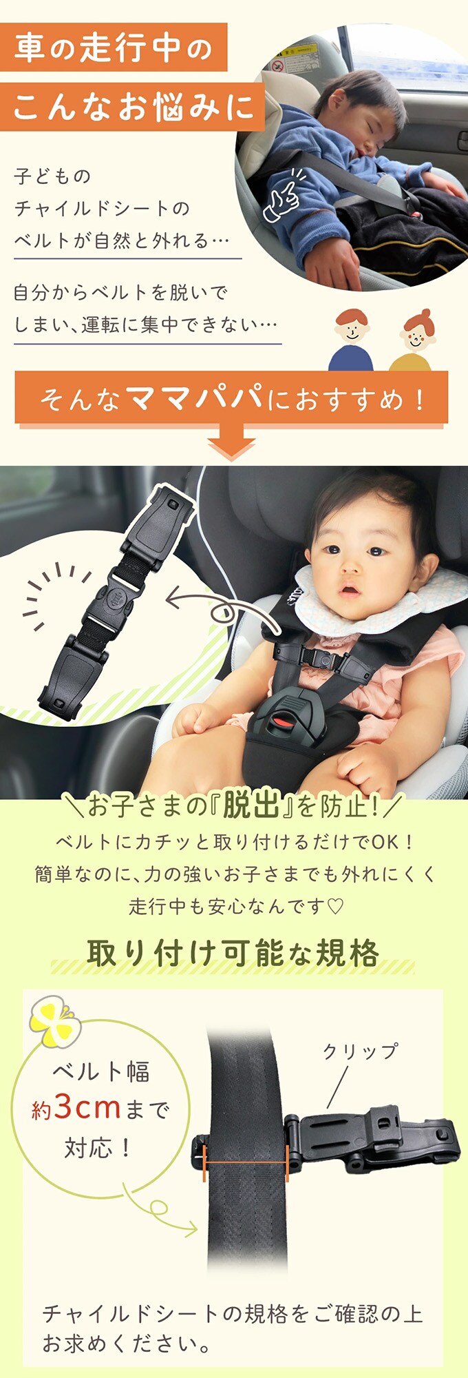ベルトにカチッと取り付けるだけでOK!簡単なのに、力のあるお子様でも外れにくく、走行中も安心です。