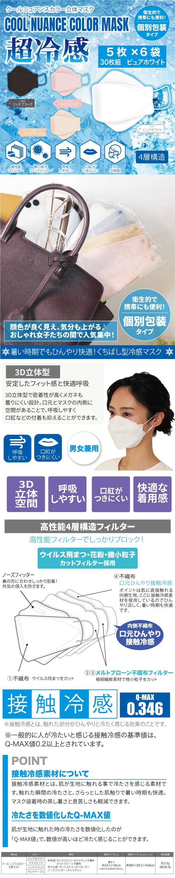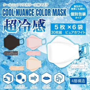 【5枚入り×6袋/ピュアホワイト】クールニュアンス立体マスク同色30枚組 | 【マスク工業会会員】暑い時期でもひんやり快適!メイク崩れも抑えられるくちばし型冷感マスク