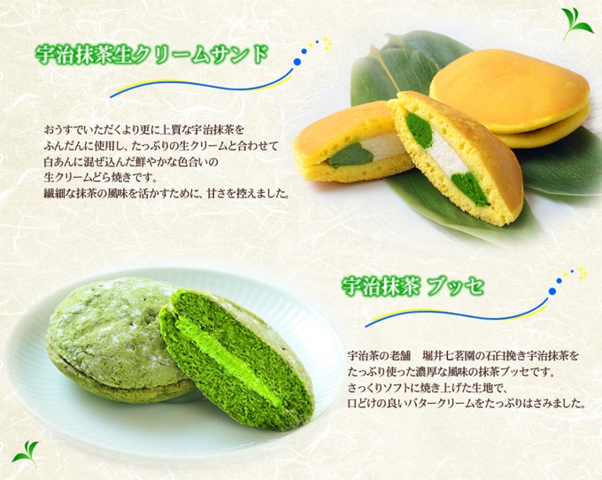 宇治茶の老舗 堀井七茗園のおうすで味わうほどの上質な石臼挽き抹茶のみを使用しています。宇治抹茶をふんだんに使用し、たっぷりの生クリームと合わせて白あんに混ぜ込んだ色鮮やかな「宇治抹茶クリームサンド」と、さっくりソフトに焼き上げた生地で、口どけの良いバタークリームをたっぷり挟んだ「宇治抹茶ブッセ」の詰合せです。