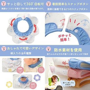 360°くるっとまわして満遍なく使えるスタイ。 表面、裏面はやさしいコットンを使用。 中層には防水生地を使用しているため服に汚れが浸透しません。 四季をイメージした柄とフリルの組み合わせがおしゃれで可愛いデザインです。