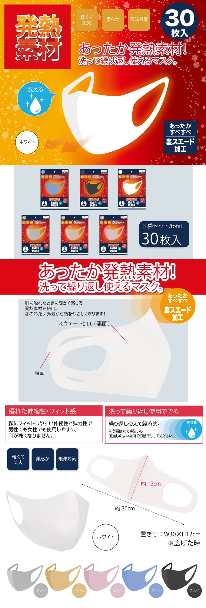 - 【3枚入り×10袋/ホワイト】ホットフィットマスク同色30枚組