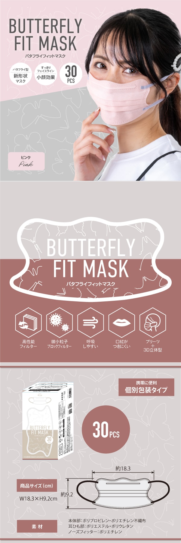 - 【30枚×1箱/ピンク】バタフライフィットマスク
