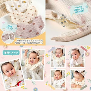 やわらか6重ガーゼで作った可愛いベビーの360°スタイ。 首元を二段階で調節できるスナップ式で着脱簡単、 長い期間使えます。 吸水性が高く実用性ばっちりで 見た目も可愛いプリント。男の子にも女の子にも使えて便利 出産祝いや出産準備、ギフトにも人気です。