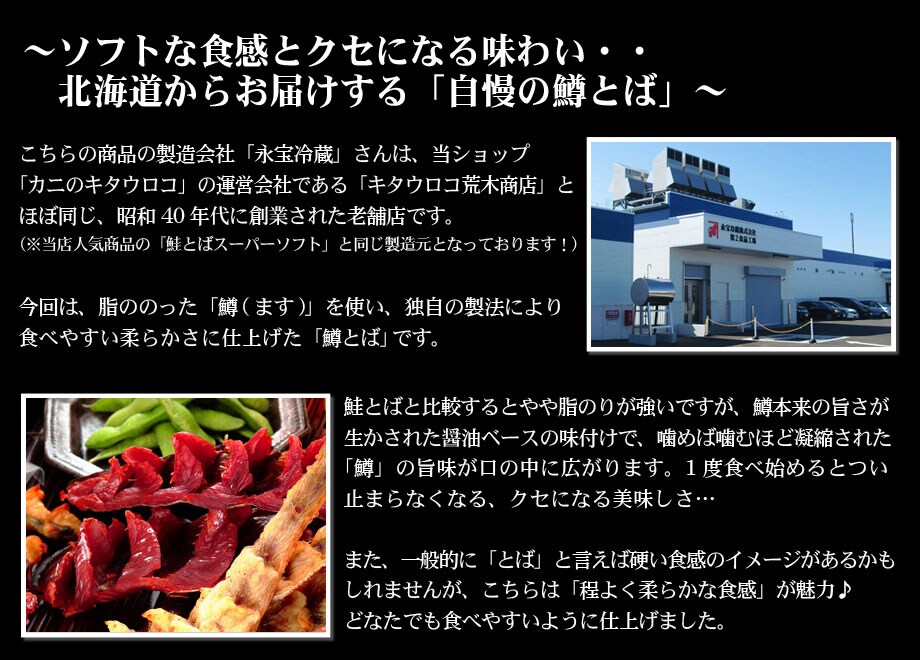 ・原材料/材質/素材:鱒(北海道産もしくはロシア産)、正油、みりん、清油、食塩、調味料(アミノ酸等)、ソルビトール、着色料(ベニコウジ)、くん液、甘味料(カンゾウ)、※一部に小麦、大豆を含む