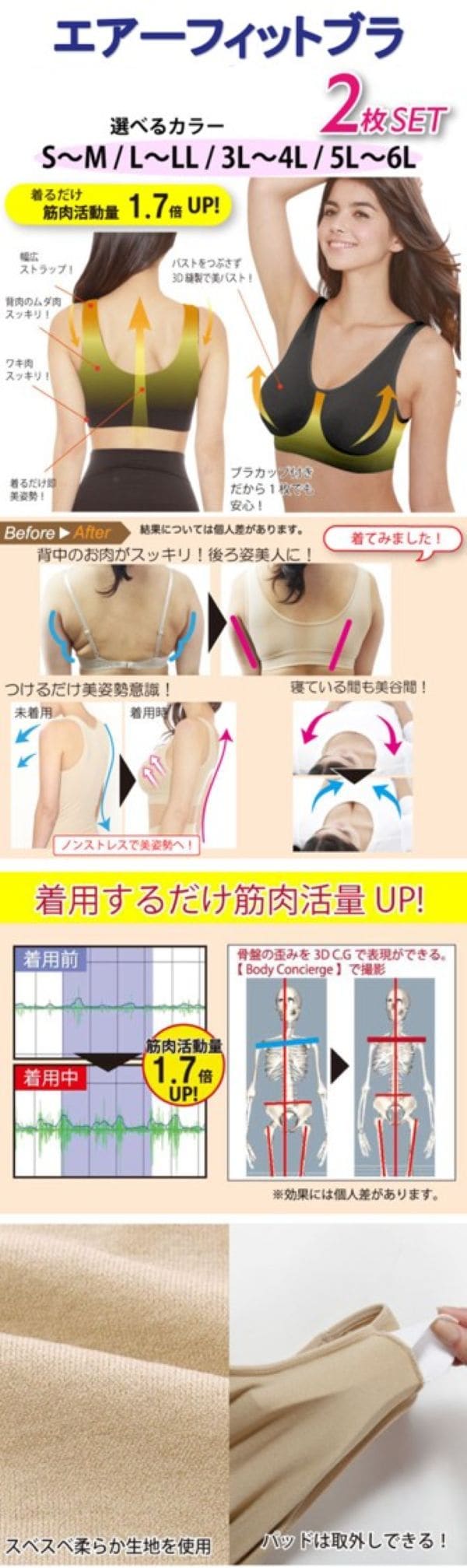 1.伸縮性がありフィット感が高い素材なので、無理なく長時間着用が出来、バストアップ&美姿勢をサポート♪