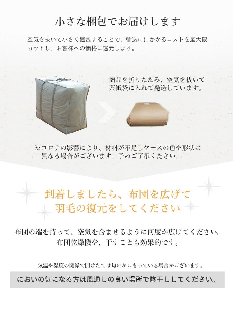 ※獣毛系の中わた商品(羽毛布団、羊毛布団等)は独特の臭いがします。これは動物性油脂に起因することです。