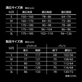 適応身長170-180cm、適応胸囲90-98cm、適応胸囲78-88cm
