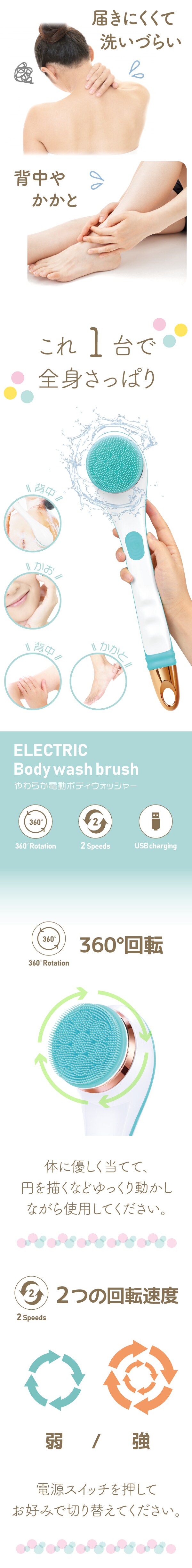 やわらか電動ボディウォッシャー(選べる4種類の替えブラシ) | 360度回転。2つの回転速度!届きにくくて洗いづらい背中やかかと。これ1台で全身さっぱり!