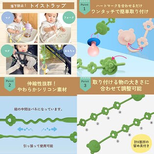 おしゃぶりやおもちゃ、マグ、哺乳瓶などの落下防止に使えます。