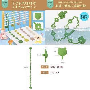 ストラップの中間部分はバネになっていて伸縮性抜群。フォークやスプーンを付けた時に使いやすく、食事中にも活躍します。