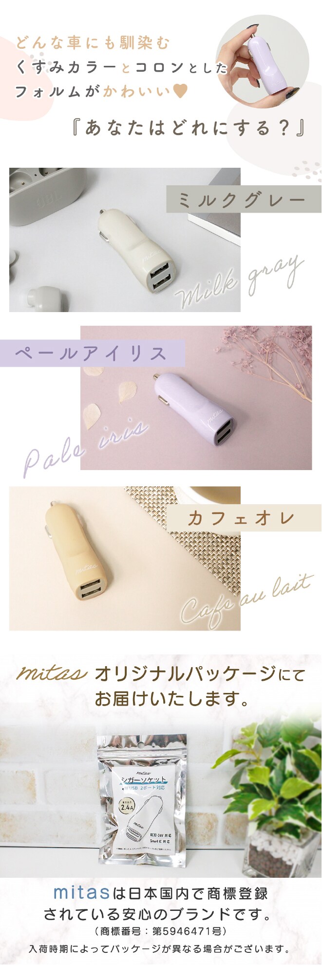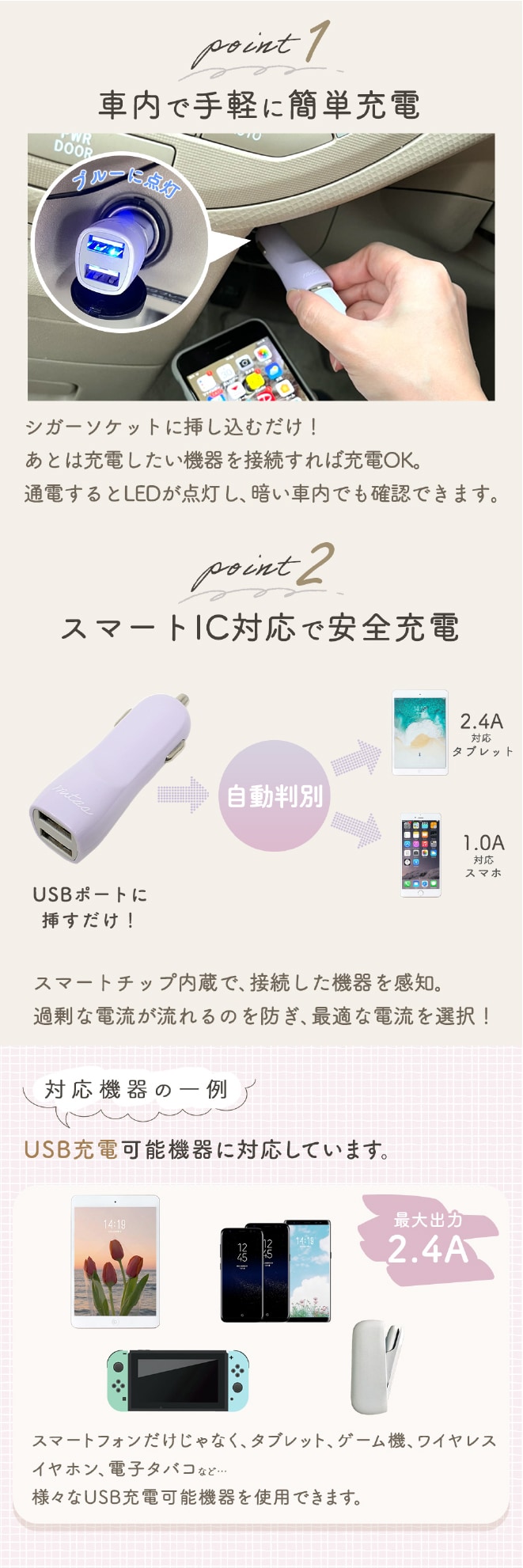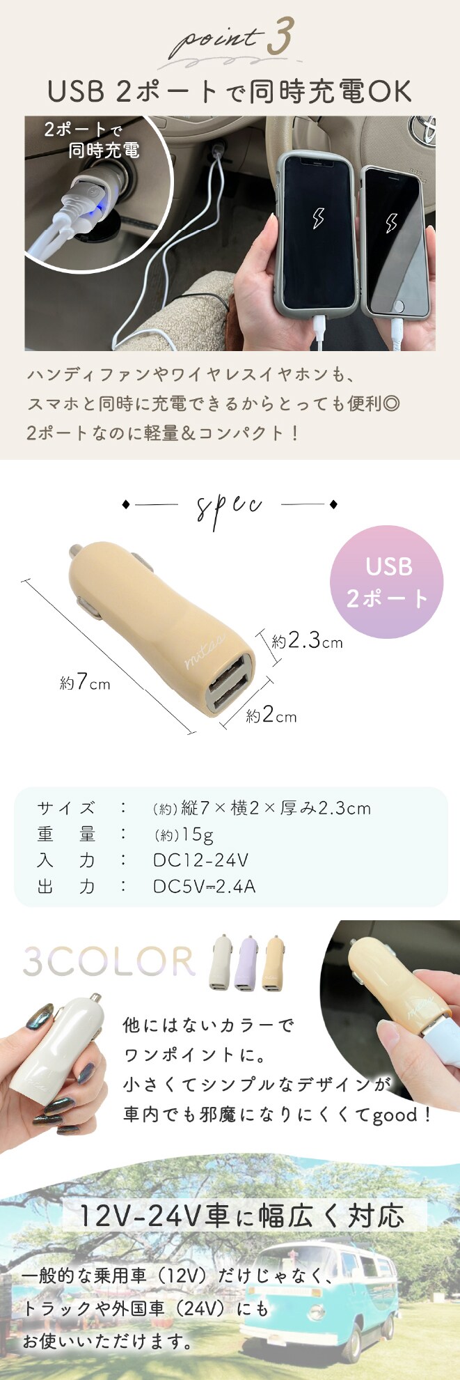 ・オシャレなカラーで車内の印象も自分好みに!2台同時に充電もできるので機能的です。