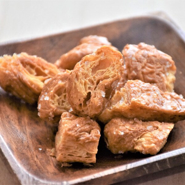 層になったクロワッサンに、ザクザク食感が心地よいザラメ糖を絡め、優しい甘さのラスクに仕上げました。