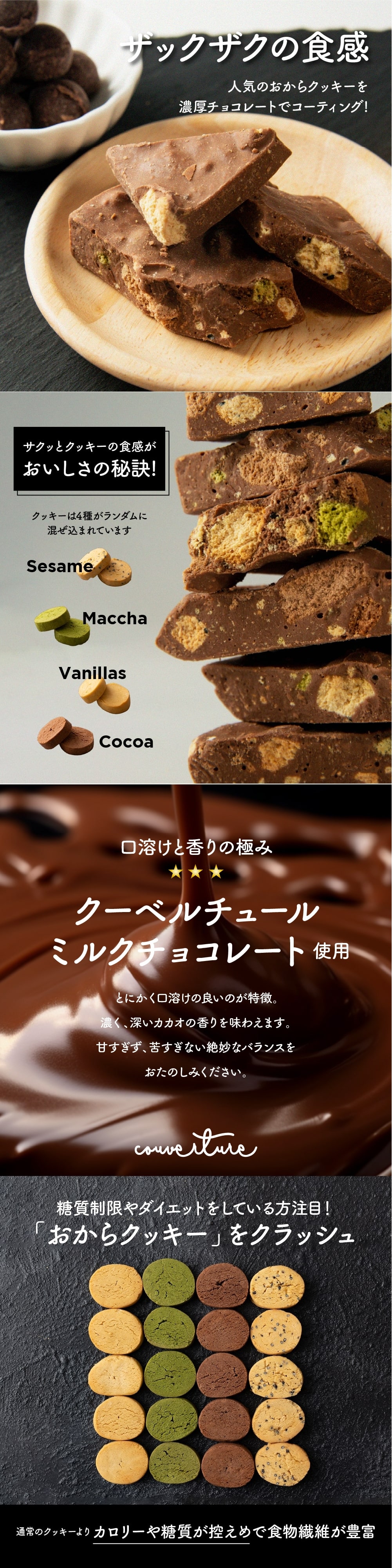 【1kg(250g×4袋)】4種のおからクッキークラッシュミルク(チャック付き) | ヘルシーな割れおからクッキーを濃厚なチョコで包みました♪ザックザクの食感が美味しさの秘訣!