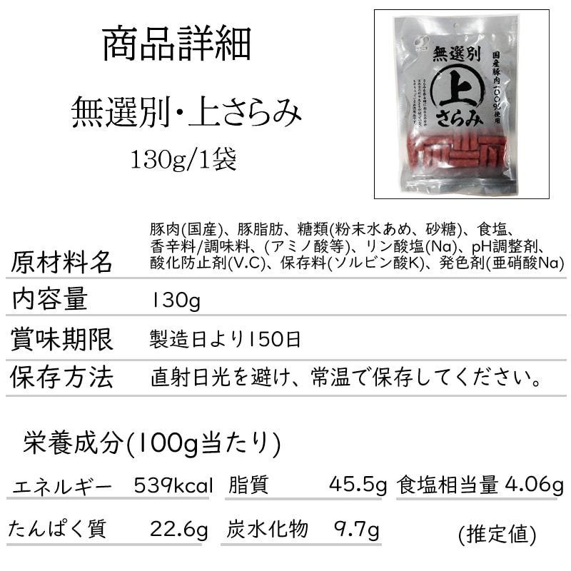 【130g×4袋】上さらみ 4袋 ご家庭用 国産豚肉使用!味わい深いワンランク上のサラミ | 着色料、大豆たんぱく、ゼラチン不使用。粗挽き肉使用で食感良し!味わい深くジューシー