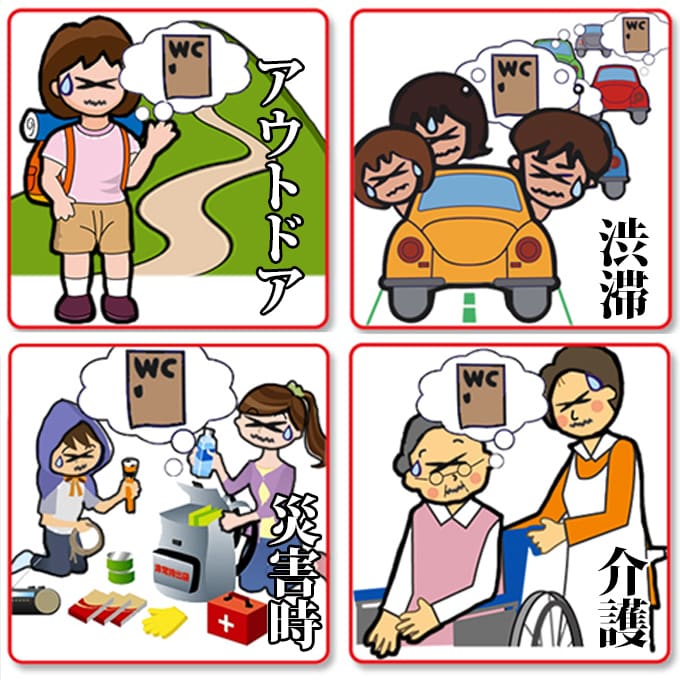 自宅のトイレ以外にもコンパクトトイレ、段ボール、バケツ等に袋をかぶせた上からかけられます。