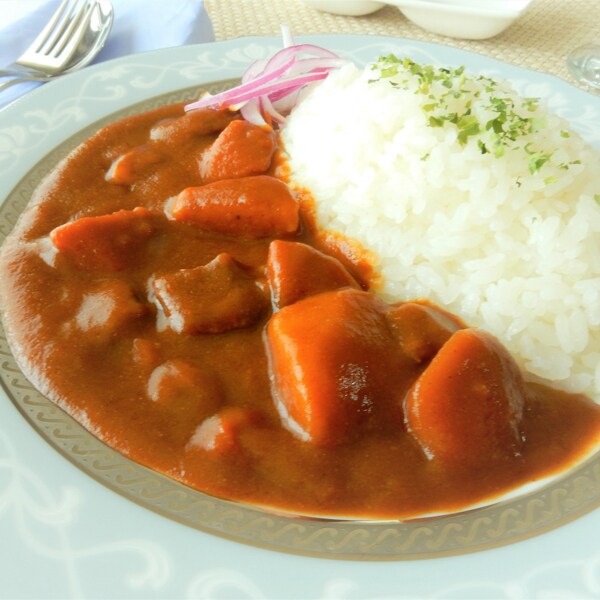 ビーフに数種の野菜(国産玉ねぎ、にんじん、じゃがいも、揚げ茄子)を加え、チャツネを隠し味に加えた味わい深いカレーと、国産玉ねぎを使用し、デミグラスソース、赤ワイン、オニオン、ニンニク、生姜、バターでうま味とコクに深みをもたせました。具材がたっぷり入ったハヤシビーフとの食べ比べセットです。