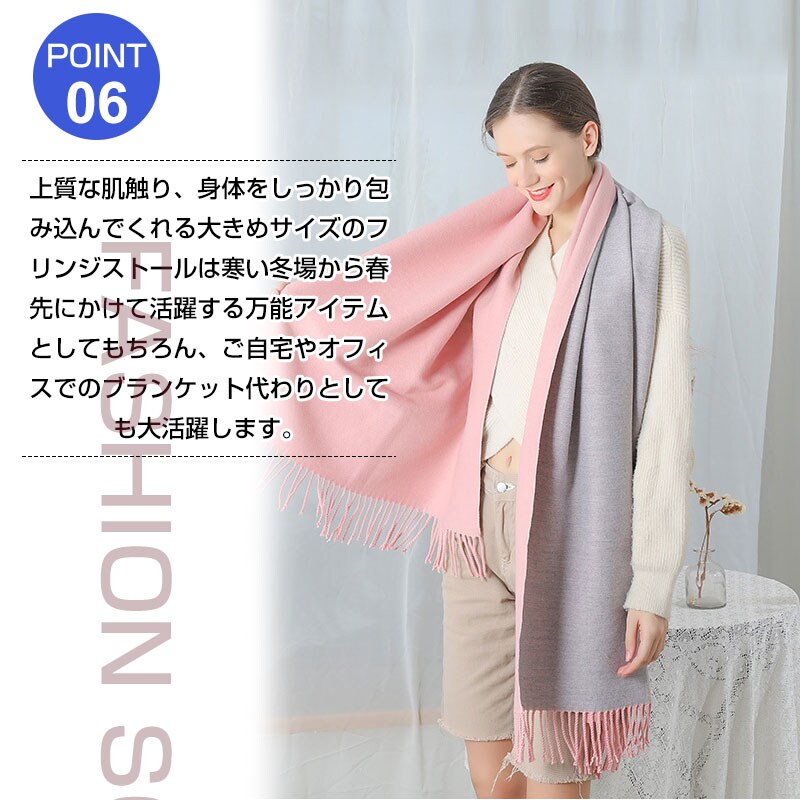上質な肌触り、身体をしっかり包み込んでくれる大きめサイズのフリンジストールは寒い冬場から春先にかけて活躍する万能アイテムとしてもちろん、ご自宅やオフィスでのブランケット代わりとしても大活躍します。