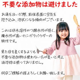 お湯を注いだ際、粉体表面に空気を抱き込み、泡状になる傾向がございます。これは非水溶性かつ親水性が低く、撥水性が高いカニガラパウダーの特性です。見た目を良くするよりも不要な添加物は使わない方が良いと考え消泡材は使っておりません。何卒ご理解の程よろしくお願い致します。