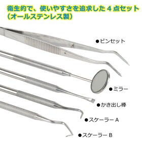 NEWデンタルケア 4点セット/ブラッシングだけでは落ちない細部の汚れに! | スケーラー、ピンセット、ミラー、かき出し棒の4点セット!自宅で簡単デンタルケア♪