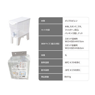 - 本体、スタンド、フタ、フィルター、蛇口、パッキン(2個)、ナット