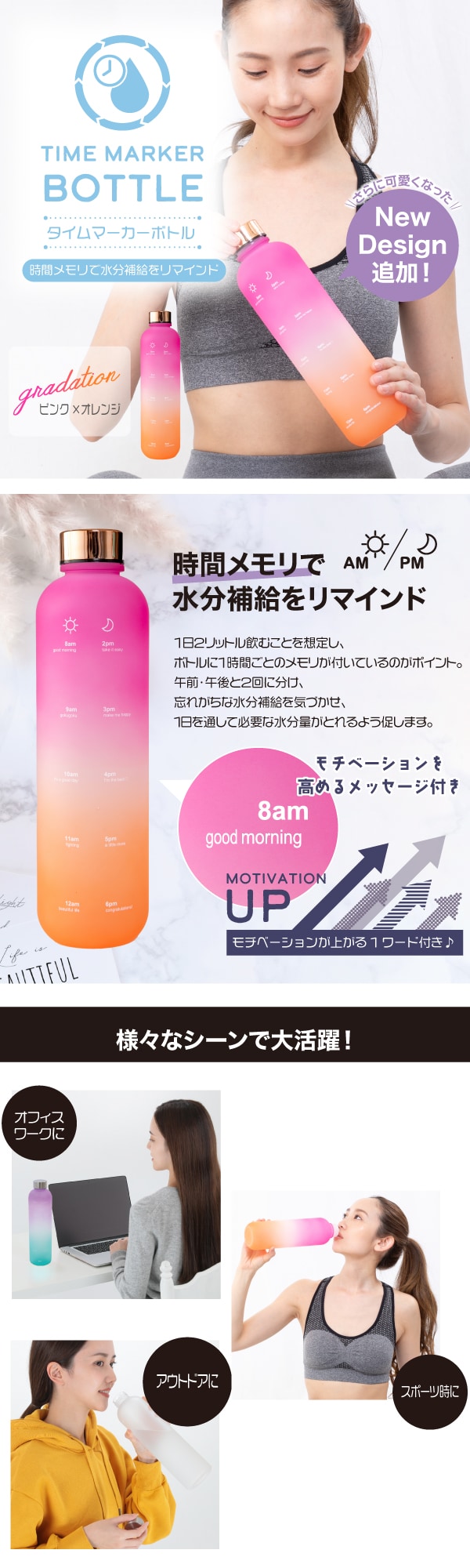 【ピンク×オレンジ】NEWタイムマーカーボトル<1L> | 時間のメモリで意識的に水分補給ができる話題のアイテム♪こまめな水分補給をサポート!!