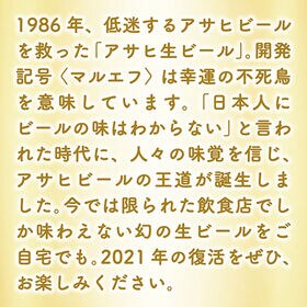 長く人々に愛されてきた、まろやかな美味しさの生ビール。長年続く製法「まろやか仕立て」で丁寧に造られる「アサヒ生ビール(通称マルエフ)」は、やわらかな口あたり、まろやかな味わい、ほどよい苦味が特長。1986年の発売以来、飲食店でファンの皆様に愛され続けてきた美味しさを、缶ビールで。家で過ごす穏やかな時間が、もっと幸せになるビールです。