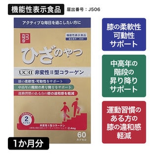 「ココカラダ ひざのやつ 非変性2型コラーゲン」は、ひざ関節が気になる方の機能性表示食品(届出表示番号 J506)です。運動習慣がある方の膝の違和感を軽減し、膝の柔軟性・可動性をサポートします。また、中高年の階段の昇り降りをサポートします。毎日をアクティブに過ごしたい方のひざ関節サポートにおすすめです。またグルコサミンで満足できなかった方にもおすすめです。