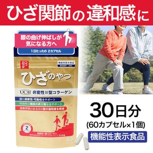 「ココカラダ ひざのやつ 非変性2型コラーゲン」は、ひざ関節が気になる方の機能性表示食品(届出表示番号 J506)です。運動習慣がある方の膝の違和感を軽減し、膝の柔軟性・可動性をサポートします。また、中高年の階段の昇り降りをサポートします。毎日をアクティブに過ごしたい方のひざ関節サポートにおすすめです。またグルコサミンで満足できなかった方にもおすすめです。