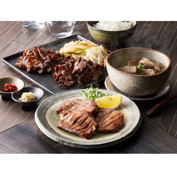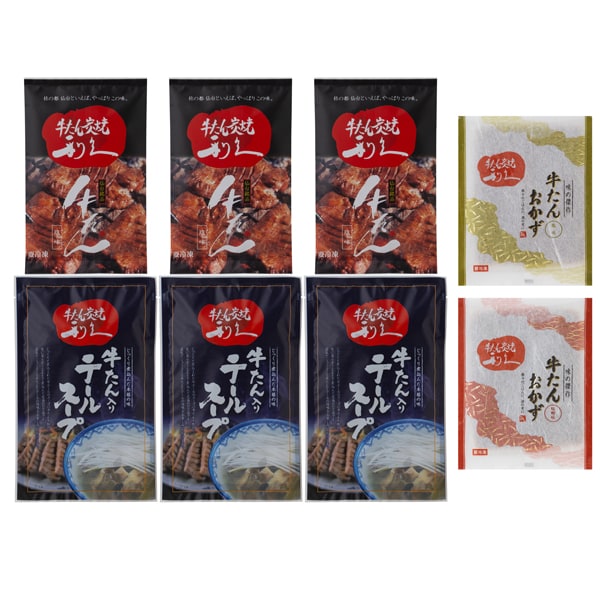 - 牛たん真空パック(塩味)100g×3、冷凍牛たん入りテールスープ250g×3、牛たんおかず塩味120g、牛たんおかず味噌味120g