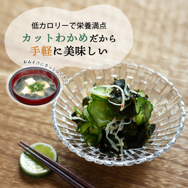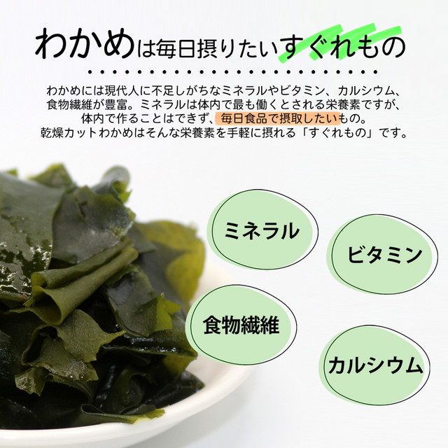 機能性成分が豊富なワカメは、毎日欠かさず摂り たい食材の一つです。どんな料理にも合わせやすく、 保存の利く乾燥ワカメだから、常備しておきたい 食材ですね。ご家族の健康管理に!