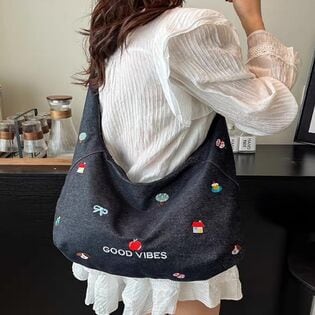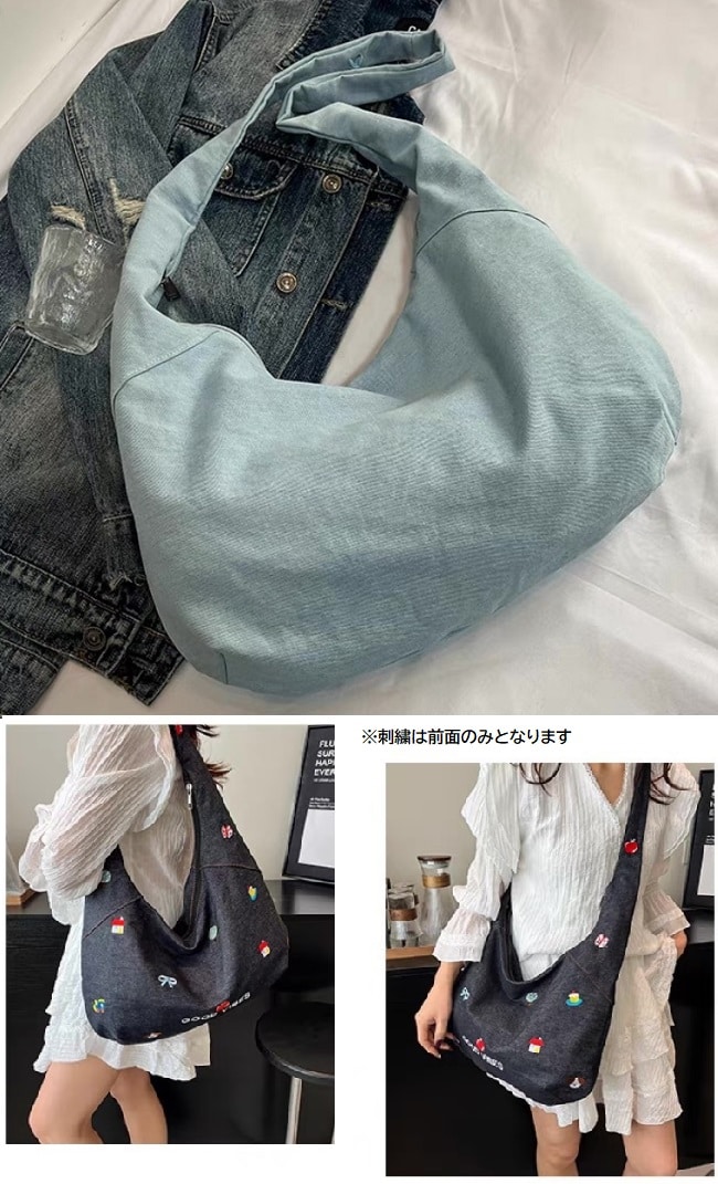 - 【ネイビー】可愛いミニ刺繍がポイントのデニムショルダー