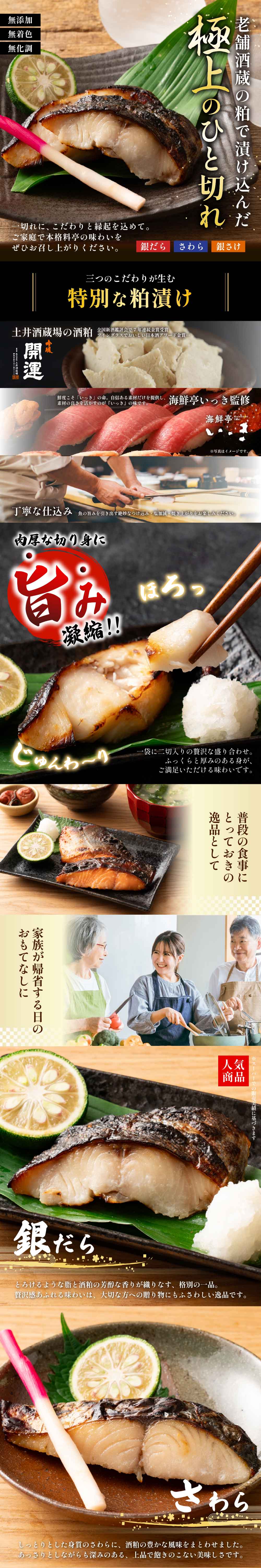 銀だら(米国)、酒粕、酒、味醂、砂糖、西京味噌、白味噌、塩、薄口醤油/調味料(アミノ酸等)