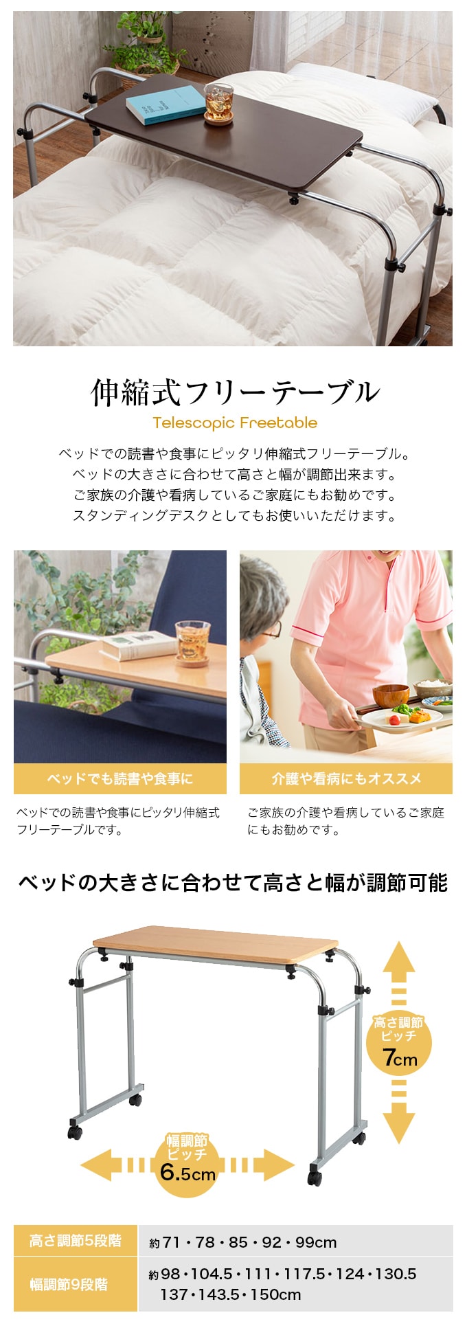 ベッドでの読書や食事にピッタリ伸縮式フリーテーブル。ベッドの大きさに合わせて高さと幅が調節出来ます。家族の介護や看病しているご家庭にもお勧めです。スタンディングデスクとしてもお使いいただけます。