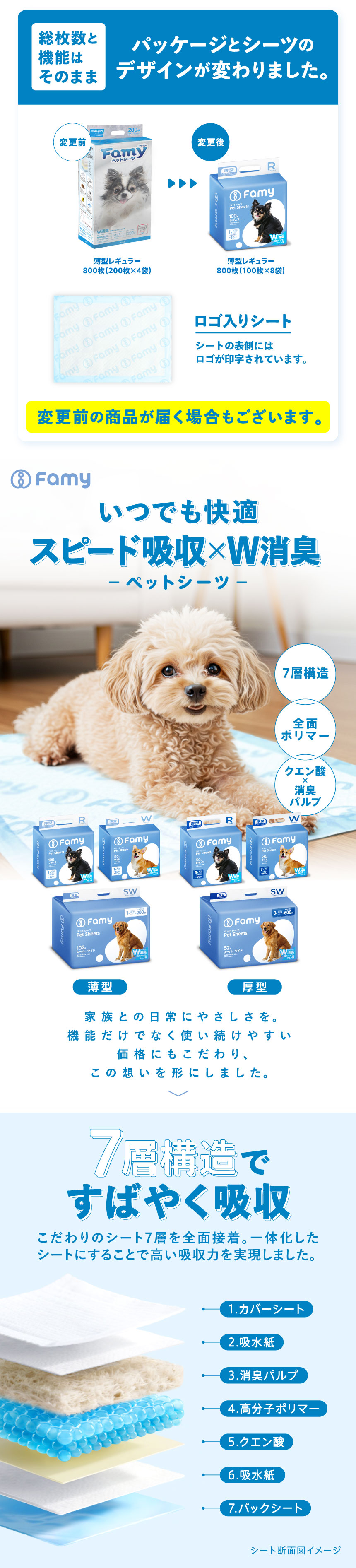 【800枚】Famy ファミー ペットシーツ薄型 レギュラー/ダブル消臭 一回使い切りタイプ | W消臭機能がついてリニューアル!こだわりの7層構造。JPPMA認証の安心安全なペットシーツ