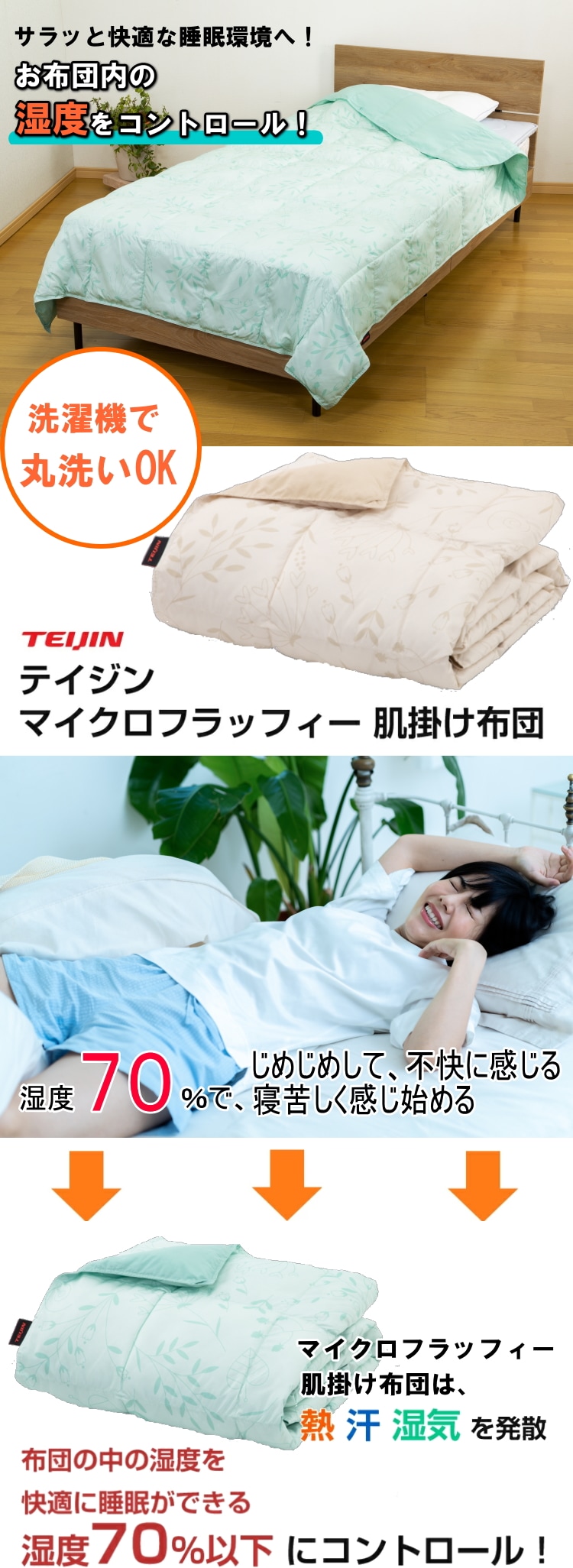 布団の中の湿度を70%以下にコントロールする「帝人 マイクロフラッフィー 肌掛けふとん」で、熱帯夜や不快な寝苦しい夜も快適な睡眠で熟睡・安眠を実現してください!