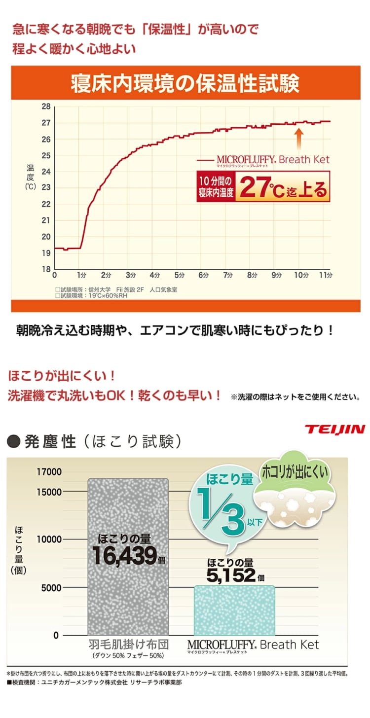 帝人 マイクロフラッフィー 肌掛けふとんは、この快眠の条件である寝床内気候(布団内の温度・湿度)を、快適な状態に整えてくれる肌掛けふとんになっています。