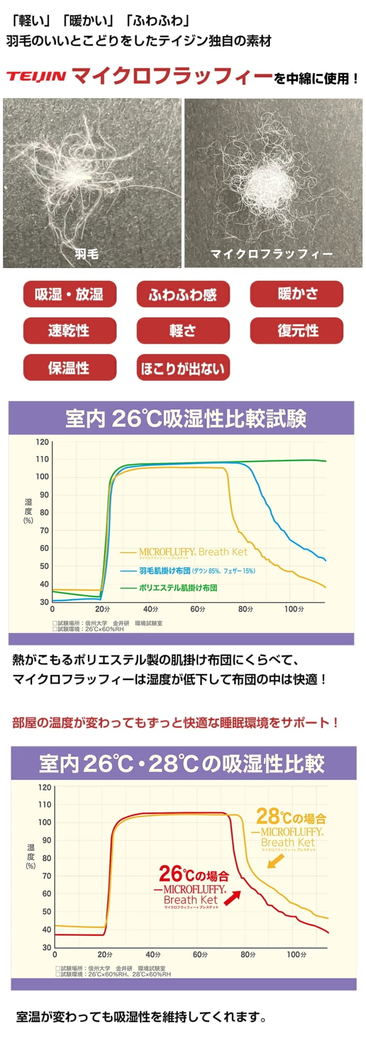 帝人 マイクロフラッフィー 肌掛けふとんは、この快眠の条件である寝床内気候(布団内の温度・湿度)を、快適な状態に整えてくれる肌掛けふとんになっています。