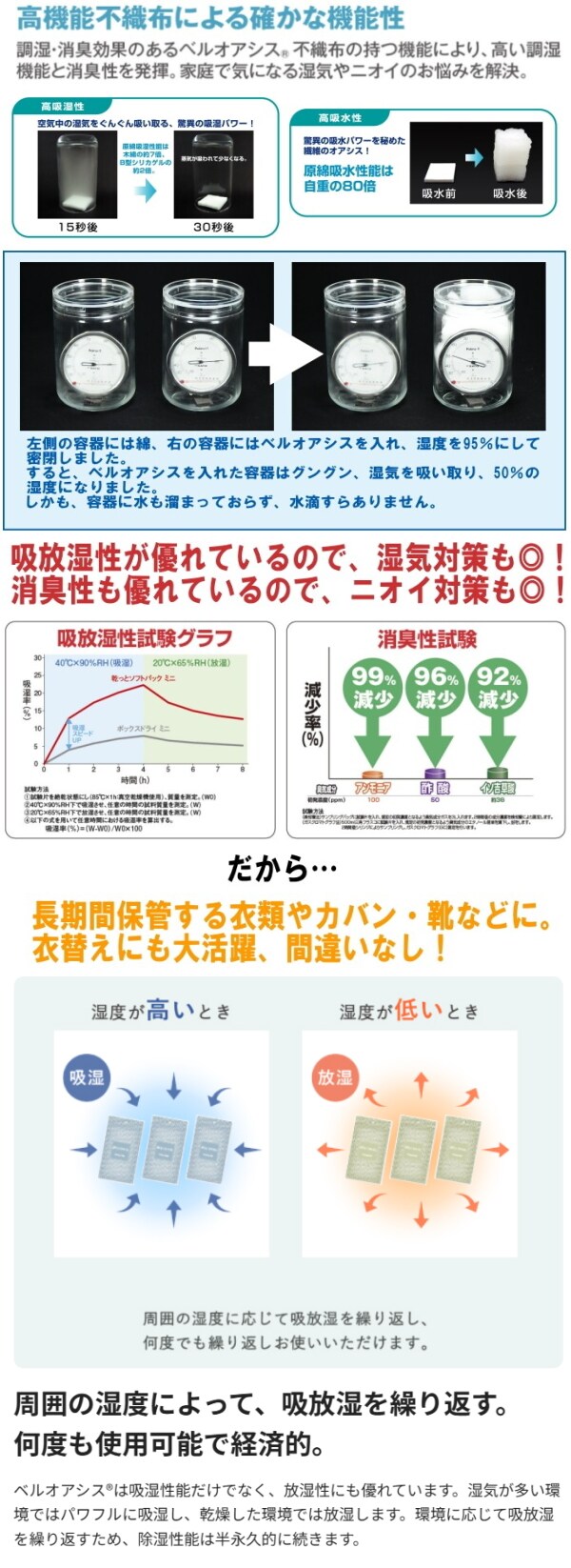 周囲が高湿度の時に吸湿し、低湿度の時に放湿する特性があるため、使い捨てではなく何度も使えて経済的です!