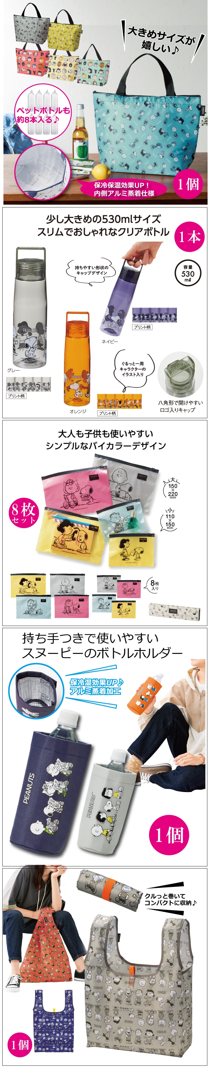 - スヌーピー保冷保温BIGトートバッグ:1個、スヌーピースライドジッパーバッグ:大小各4枚(計8枚)、スヌーピー530ml軽量クリアボトル:1個、スヌーピー 持ち手つき保冷保温ボトルホルダー:1個、スヌーピー丸めるエコバッグ:1個