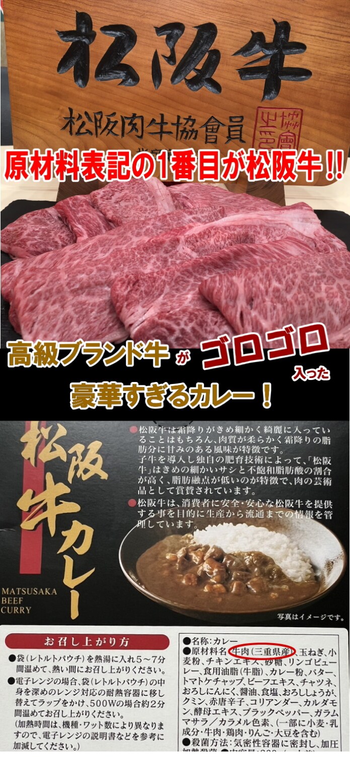 牛肉(三重県産)、玉ねぎ、小麦粉、チキンエキス、砂糖、リンゴピューレ、食用油脂(牛脂)、カレー粉、バター、トマトケチャップ、ビーフエキス、チャツネ、おろしにんにく、醤油、食塩、おろししょうが、クミン、赤唐辛子、コリアンダー、カルダモン、酵母エキス、ブラックペッパー、ガラムマサラ/カラメル色素、(原材料の一部に小麦、乳成分、牛肉、・鶏肉・りんご・大豆を含む)