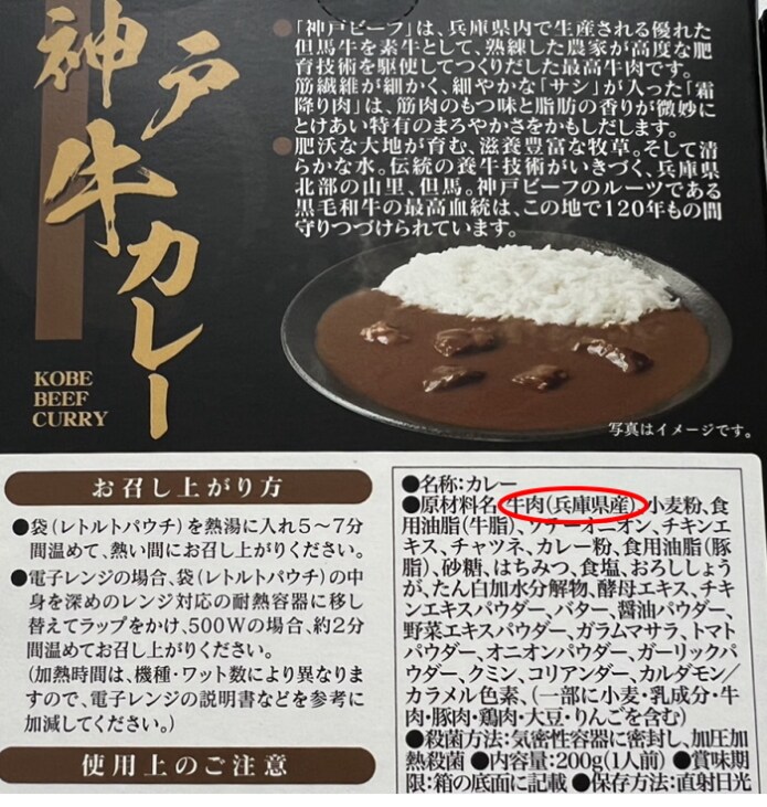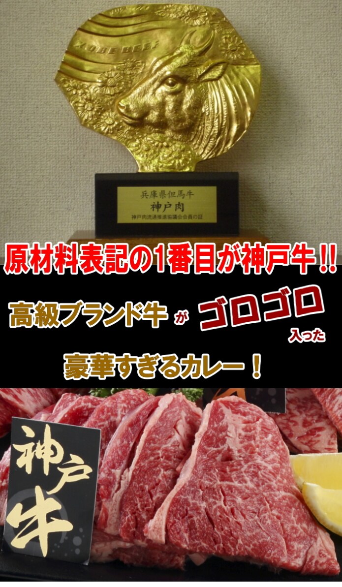 牛肉(兵庫県産)、小麦粉、食用油脂(牛脂)、ソテーオニオン、チキンエキス、チャツネ、カレー粉、食用油脂(豚脂)、砂糖、はちみつ、食塩、おろししょうが、たん白加水分解物、酵母エキス、チキンエキスパウダーバター、醤油パウダー、野菜エキスパウダー、ガラムマサラ、トマトパウダー、オニオンパウダー、ガーリックパウダー、クミン、コリアンダー、カルダモン/カラメル色素(一部に小麦・乳製品・牛肉・豚肉・鶏肉・大豆・りんごを含む)